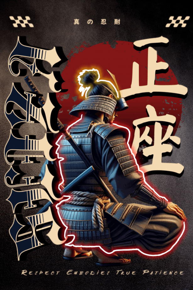 seiza hållning, samurajsjäl, tålamodskraft, krigarkod, tyst styrka, bushidoglöd, neonära, katanastillhet, sann disciplin, uråldrig balans.