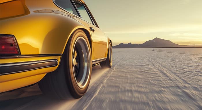 I gryningens skär möter en gyllene klassiker framtidens estetik. En Porsche susar fram över saltets släta spegel, omgiven av ljusets ramar – lila hjulringar, cyan konturer, och en kaross som glöder som smält metall i soluppgång.