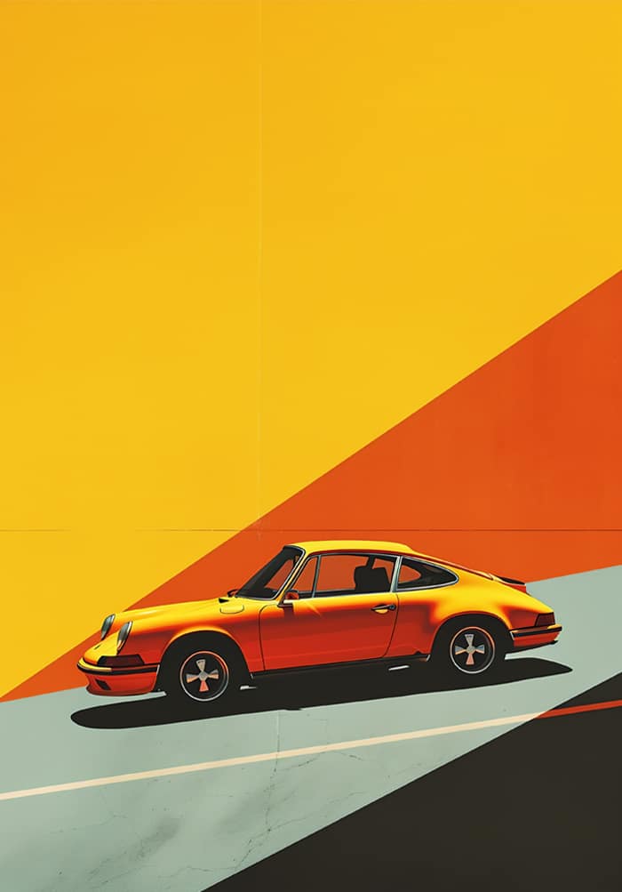 En nostalgisk siluett i neonförklädnad. Den rödorange bilen vilar mot en grafisk vägg av solgult, bränt rött och betonggrått – men står aldrig stilla. Den är laddad. Den är redo.