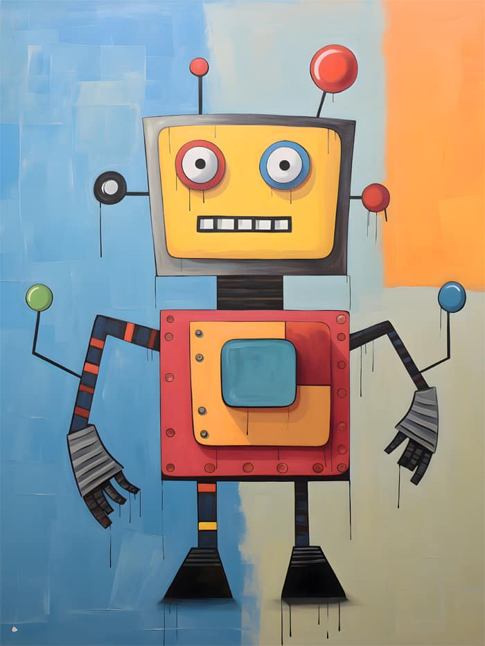 Robot barnposter, futuristisk väggkonst, färgglad robotillustration, teknik för barn, lekfull rymdrobot, grafisk barnrumsdekor, popart robot, mekanisk vän, barnrum konst neon, modern retrostil
