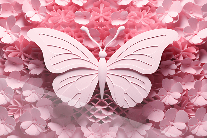 En förtrollande fjäril i mjukt rosa, omgiven av ett hav av blomblad i olika nyanser av rosa. Den varma gula neonbelysningen får fjärilen att lysa som en dröm i ett romantiskt blomsterlandskap – perfekt för att skapa en känsla av kärlek och harmoni.