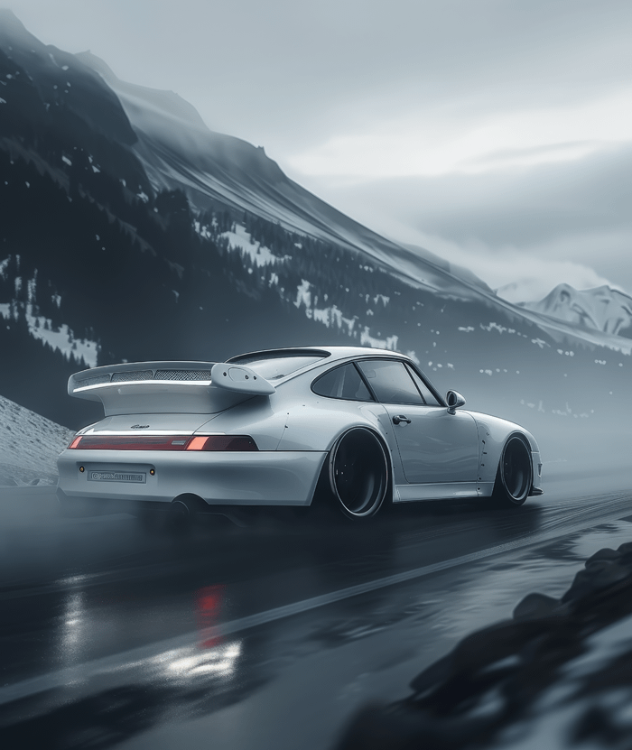 Porsche 911 Classic, neondimma, regnvåt asfalt, bergspass i skymning, glödande hjul, tyst fart, cybernostalgi, vinterstorm-estetik, elektrisk ensamhet, ghostrider mood