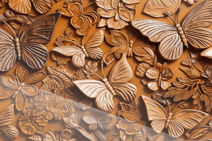 I ett hav av handskulpterade träfjärilar och löv träder en fjäril fram – omgiven av ett mjukt lila neonljus som skär genom det varma trälandskapet. Detaljrikedomen i varje kontur vittnar om tid och hantverk, där natur och konst förenas. Den upplysta fjärilen symboliserar livets puls, ett andetag i den stilla skogen.