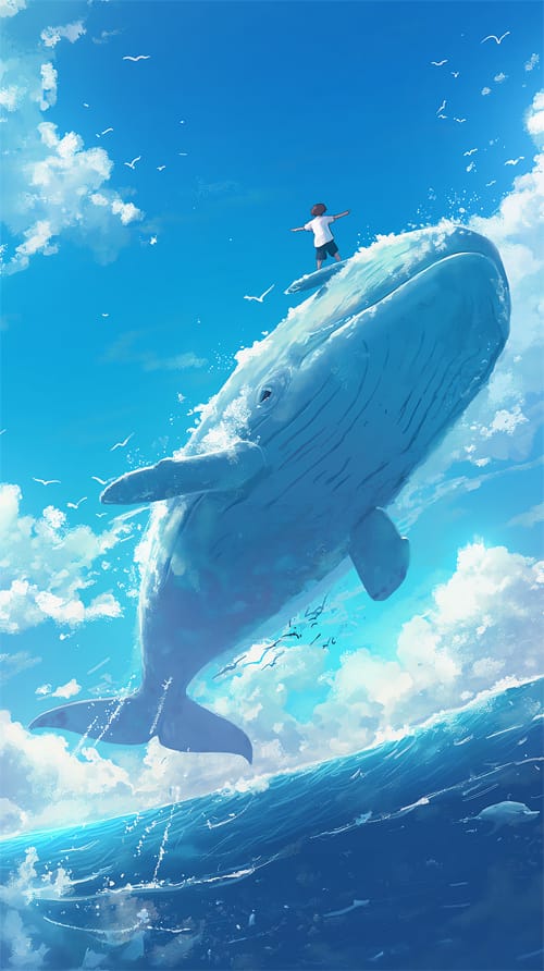 Ett ögonblick i en drömvärld – en pojke balanserar ovanpå en kolossal val som bryter genom himmel och hav. Neonlinjen lyser grönt kring det enorma djuret, som om det bär på en uråldrig kraft uppstigen ur havets djup.
