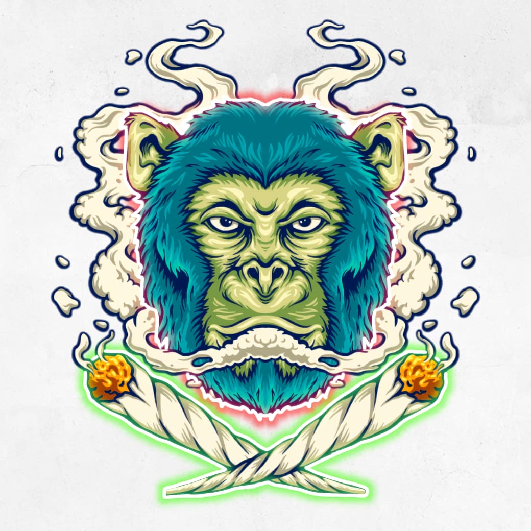 Ett ap-liknande väsen med mystiskt uttryck stiger fram ur virvlande rök, som om det precis klivit ut från en vision. Två tätt tvinnade joints glöder framtill och ramar in bilden med en grön neonglöd. Apans blick är fokuserad, nästan allvetande – som en stoner-shaman i djungelns hjärta.