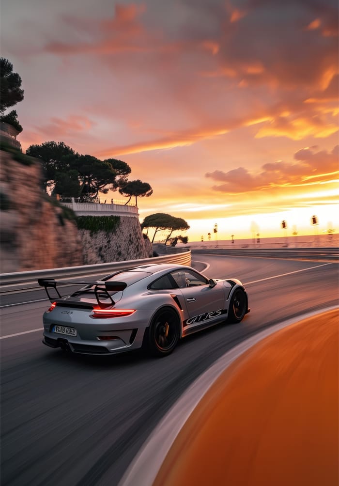 neonbil, GT3RS, solnedgångskörning, kustracing, glow wheels, futuristisk kurvtagning, speed sculpture, voltage style, red light motion, cyber apex