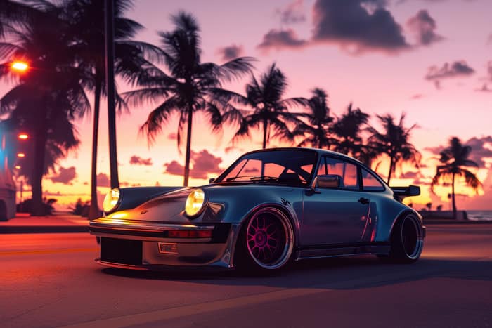 Porsche 911, neonretro, tropisk kväll, solnedgångsestetik, 80-talsinspirerad bilkonst, ljusdesign, kromglans, palmreflektioner, nostalgisk futurism.