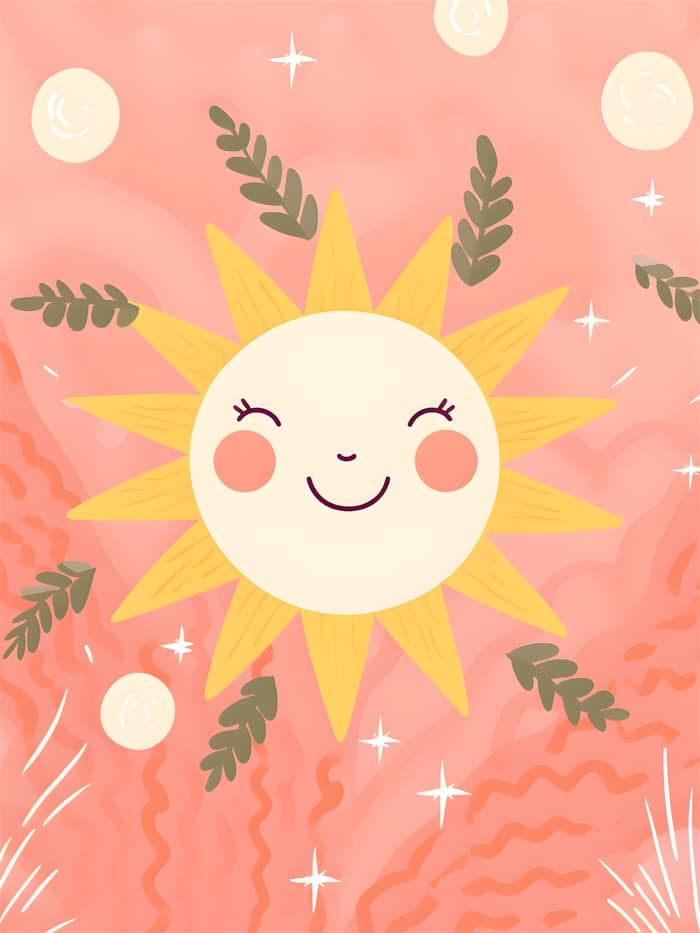 En leende sol med rosa kinder sprider glädje över en varm, aprikosfärgad himmel. Solens strålar är som mjuka penseldrag, och den omges av glittrande stjärnor, mjuka löv och runda ljuskulor – allt i en sagolik symfoni av värme.