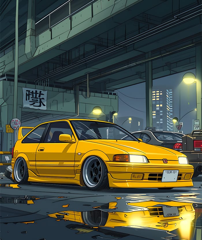 En hyperkromgul silhuett vilar under Tokyos glödande broar, insvept i reflektioner av neon och regn. Med röd kontur och limegröna fälgar ser den inte ut att stå still – den samlar kraft. Det är ett ögonblick av laddad tystnad innan farten släpps fri.
