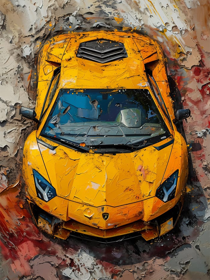 Den intensiva gula lacken bryter igenom en dramatisk bakgrund av krossad jord, penseldrag och eldiga nyanser. Lerstänk blandas med digitala strukturer, där varje repa och smutsfläck förstärker känslan av rörelse. Allt andas rå energi – som om bilen är på väg att spränga sig ut ur tavlan.