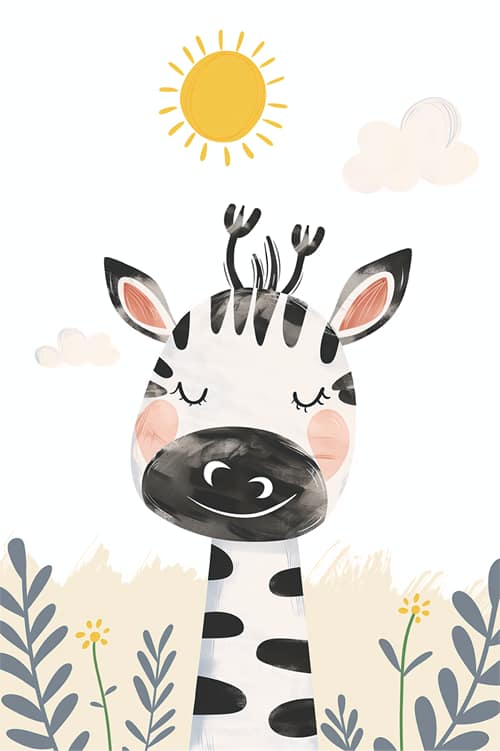 söt zebra illustration, barnposter med zebra, djur i solsken, nordisk barninredning, zebra med blommor, lekfull djurposter, svartvit zebra konst, afrikanska djur för barnrum, mild och rolig barnillustration, dagdröm i savannen