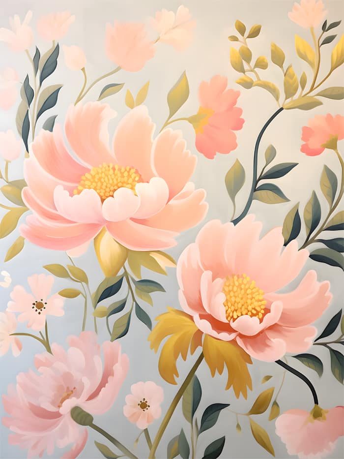 Pudriga rosa, persikotoner och soligt gult blandas med dämpade gröna och blågrå blad på en ljus, disig bakgrund. Den subtila färgsättningen och de svepande formerna ger bilden en känsla av rörelse, mjukhet och tidlös elegans.