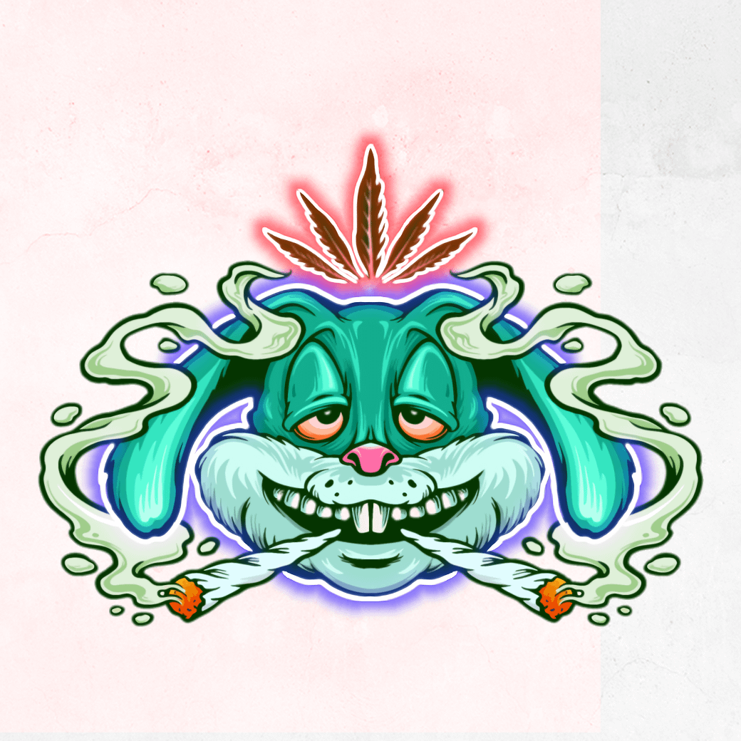 Ett humoristiskt och psykedeliskt konstverk som visar en turkos kanin med stora, trötta ögon och ett brett, flinande leende. Kaninen håller två tända joints i munnen, båda med en orange glöd och omgivna av rök. Ovanför kaninens huvud syns ett stiliserat brunt cannabisblad med en röd neonkontur. Runt hela kaninen finns en ljuslila neonliknande aura och virvlande ljusgrön rök. Konstverket har en slät och glansig epoxibeläggning som förstärker färgerna och ger en skyddande yta.