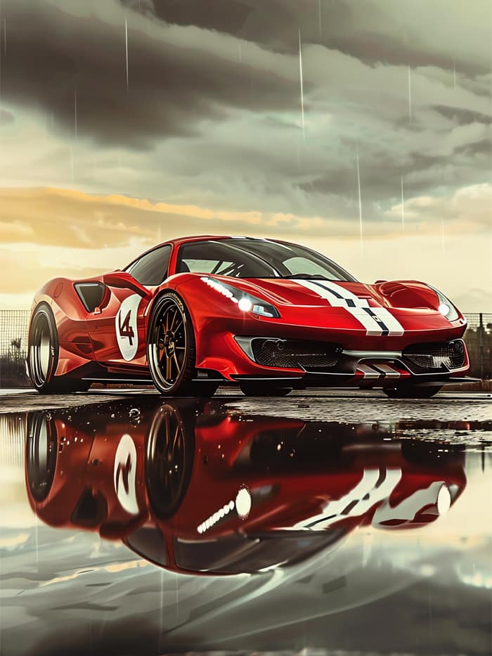 Den står inte stilla – den laddar. En Ferrari med nummer 4, fångad mitt i ett nedslag. Neonlila hjul, gröna blickar, och en kaross som skär genom regnet som ett blixtnedslag i slowmotion.