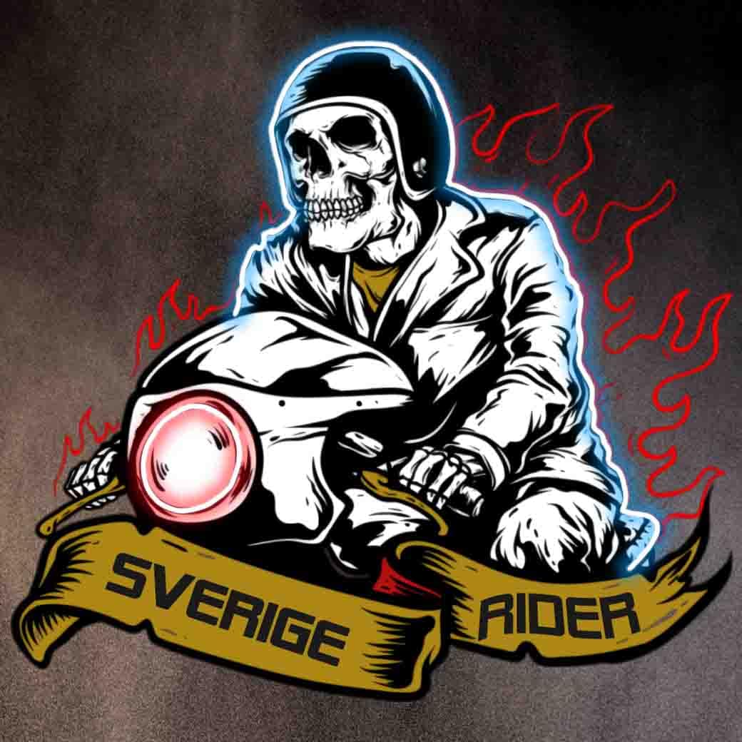 Illustrationen föreställer en dödskalleklädd motorcyklist som kör i hög fart. Han bär en svart hjälm och en vit jacka, vilket ger honom en klassisk biker-look. Motorcykelns strålkastare lyser kraftigt, och runt föraren finns eldflammor, vilket förstärker känslan av fart och intensitet. Nedanför motorcykeln finns ett band med texten “Sverige Rider”, vilket antyder en svensk motorcykelkultur eller gemenskap.
