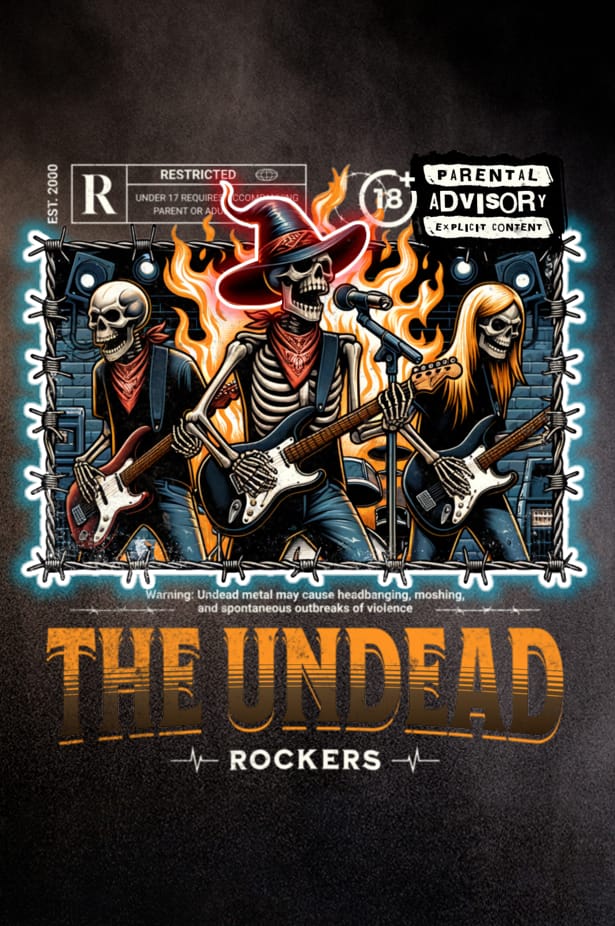 Ett tufft och iögonfallande konstverk som visar ett band bestående av tre skelett som spelar elgitarr och sjunger på en scen. I mitten står ett skelett med en röd hatt och bandana, sjungandes i en mikrofon och spelandes gitarr. Till vänster och höger står ytterligare två skelett med gitarrer. Bakgrunden är fylld med taggtråd och flammor i orange och gult, framhävt av en ljusblå neonkontur runt bandet. Ovanför bandet syns varningstexter och symboler för åldersgräns (18+) och explicit innehåll. Under bandet står texten “THE UNDEAD” i stora, orange bokstäver med en vit kontur, och under det “ROCKERS” med en EKG-liknande linje på sidorna. Konstverket har en slät och glansig epoxibeläggning som förstärker färgerna och ger en skyddande yta.