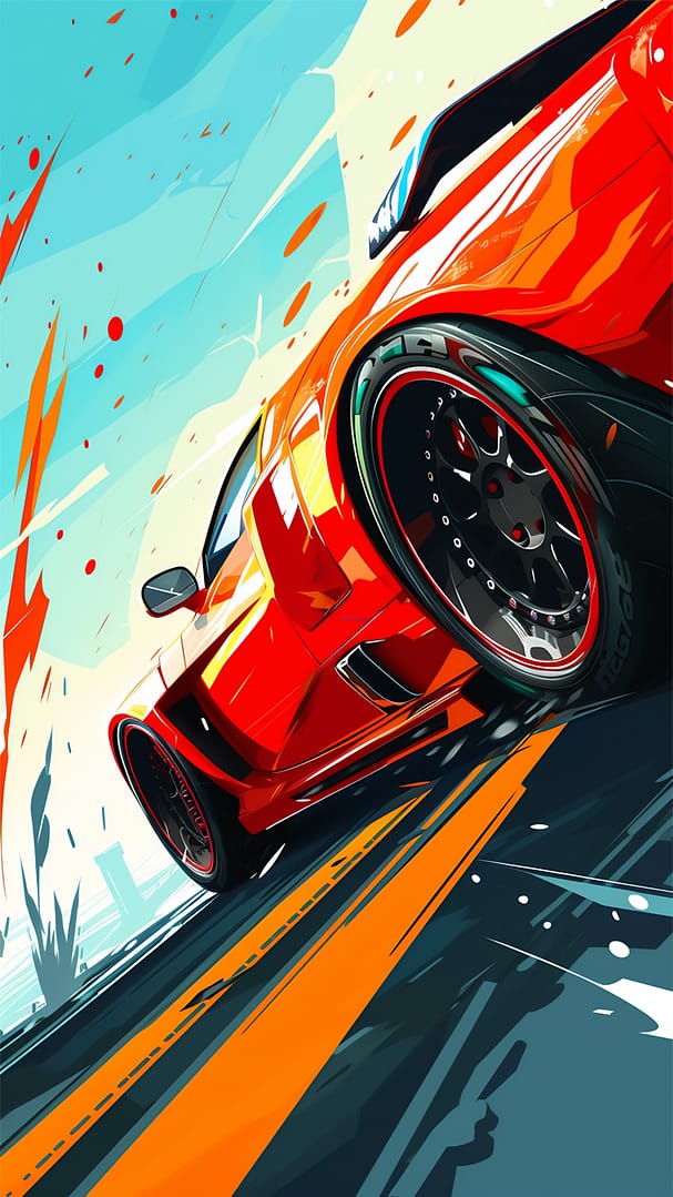 Den orangea vägmarkeringen delar scenen som en blixt. Bilens lutning signalerar fartens yttersta gräns – ett fruset ögonblick av maximal acceleration.