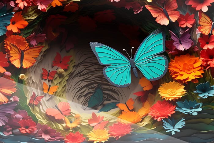 Förhöjer djupet i fjärilens vingar och blommornas textur.