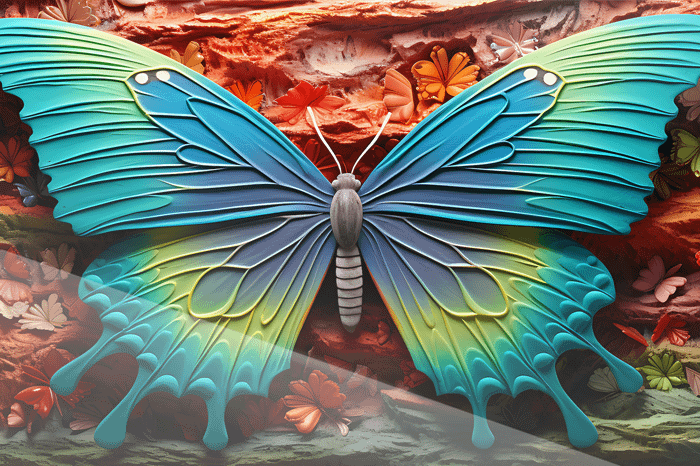 Denna unika väggkonst framhäver en fjäril i skimrande turkos och limegrön färgskala, inramad av varmgul neonbelysning. De detaljerade vingarna med droppformade mönster skapar ett livligt uttryck. Bakgrunden i jordiga röda och gröna toner är dekorerad med små fjärilar, vilket ger verket ett naturligt och fantasifullt djup. En perfekt färgexplosion för dig som älskar levande och naturnära konst.