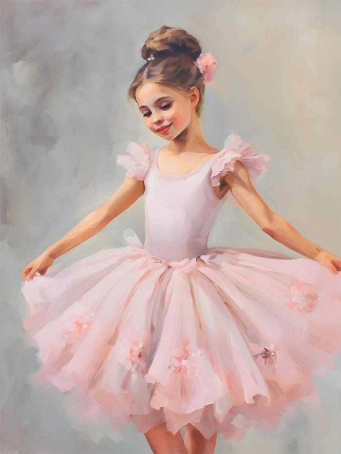 En liten ballerina står med armarna utsträckta, som om hon omfamnar ett ögonblick av stillhet. Hennes kjol i pudrigt rosa veckar sig som blomblad i mjuk rörelse, dekorerad med små blommor som tycks ha landat där med vinden. Hennes ögon är slutna i ett stilla leende – som om hon dansar till musik endast hon kan höra. En blomma i håret matchar de skira tonerna i hennes tutu, medan bakgrunden smälter samman i dimmiga pastellfärger som en dröm.