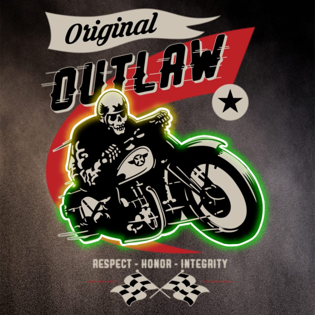outlaw biker art, neon skull rider, retro racing rebellion, ghost motorhead icon, integrity in the ashes, neon bones motorcycle, punk Americana vintage, skeleton chopper poster, death rider badge, respect honor street creed
