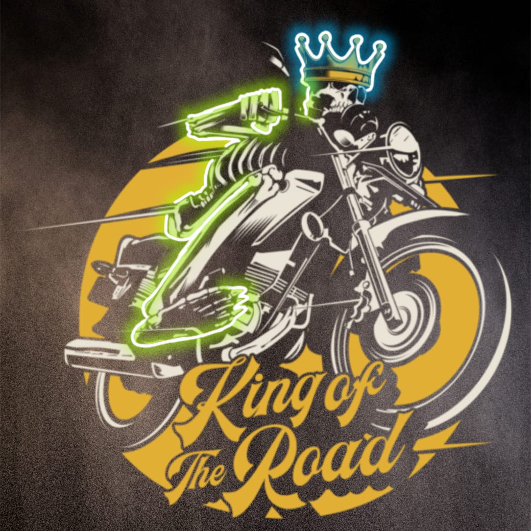 king rider design, dödskung på mc, neonrider art, ghost biker legend, road royalty, evig regent av asfalten, bensinkrona, undead throttle, skelett i sadeln, monark av mörkret.