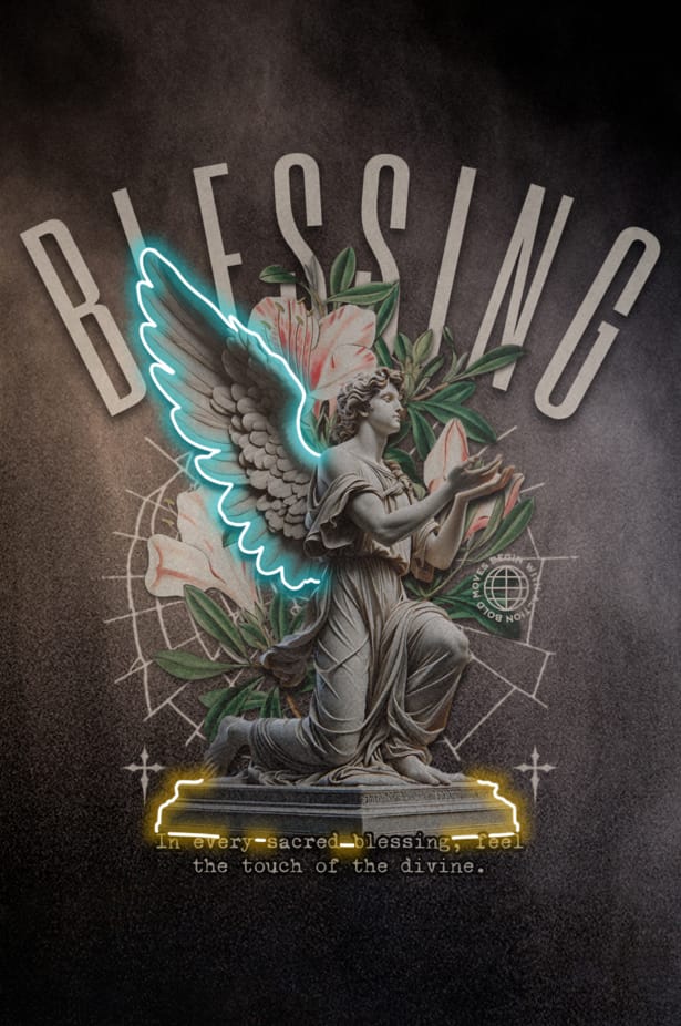 Ett vackert och stämningsfullt konstverk som visar en knäböjande ängel i en böneliknande position med händerna framför sig. Ängeln har stora, detaljerade vingar, varav den ena är framhävd med en stark turkos neonkontur. Runt ängeln finns stiliserade blommor och en subtil bakgrund av geometriska linjer och symboler. Ovanför ängeln står ordet “BLESSING” i stora, ljusa bokstäver med en mörk kontur. Under ängeln, vid basen, finns en text i gult som lyder “in every sacred blessing, I feel the touch of the divine.”. Konstverket har en slät och glansig epoxibeläggning som förstärker ljuset och färgerna och ger en skyddande yta.