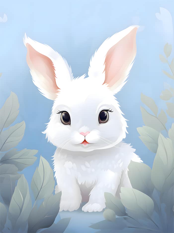 Med nyfiken blick och silkesvit päls sitter den lilla kaninen omgiven av mjuka blad i dämpade pastelltoner. Den stora rosenrosa nosen och de vänliga ögonen ger denna illustration en förtrollande närvaro – som hämtad ur en sagovärld där våren alltid är ny.