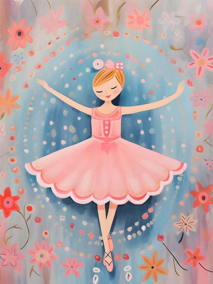 En graciös liten ballerina svävar i dansens mitt, med armarna elegant utsträckta som om hon omfamnar en hemlig melodi. Hennes rosaskimrande kjol, med vågiga kanter likt blomblad, snurrar mjukt runt henne. Blommor pryder det gyllene håret och med slutna ögon tycks hon förlorad i en värld av virvlande kronblad och viskande drömmar. Runt henne sprider sig mjuka prickar och blommande mönster som en magisk krusning i en förtrollad trädgård.