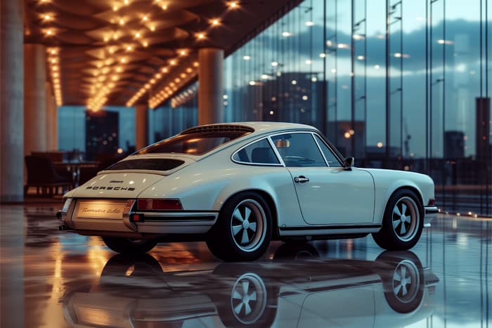 I skenet av glasfasader och polerade golv står en klassisk Porsche som ett konstverk i rörelse. Stillheten bryts av neonens puls – en vit dröm i ett digitalt landskap.